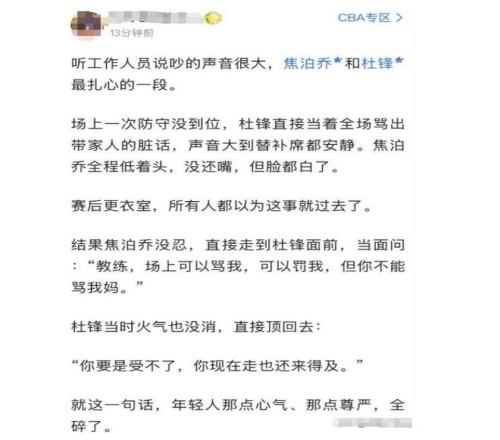 昨晚廣東球迷評(píng)論區(qū),有“知情人”從廣東隊(duì)工作人員那里打聽(tīng)到其中內(nèi)幕,其實(shí)是廣東隊(duì)更衣室爆發(fā)了內(nèi)訌,之前比賽場(chǎng)上有一次防守沒(méi)到位,杜鋒直接當(dāng)著全場(chǎng)罵焦泊喬,回到更衣室后,焦泊喬沒(méi)忍住,直接走到杜鋒面前說(shuō):“場(chǎng)上可以罵我,可以罰我,但你不能罵我媽。”而杜鋒的回應(yīng)也非常直接:“你要是受不了,你現(xiàn)在走也還來(lái)得及?!?/p>