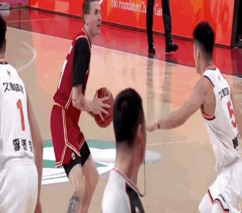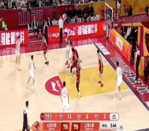 第三節(jié)上海男籃的最后一攻,李添榮開(kāi)邊線球,古德溫外線接球,面對(duì)迪亞洛,干拔三分不進(jìn),懷特塞德拿到籃板,傳給李添榮,直塞籃下劉禮嘉,后者成功吃餅。