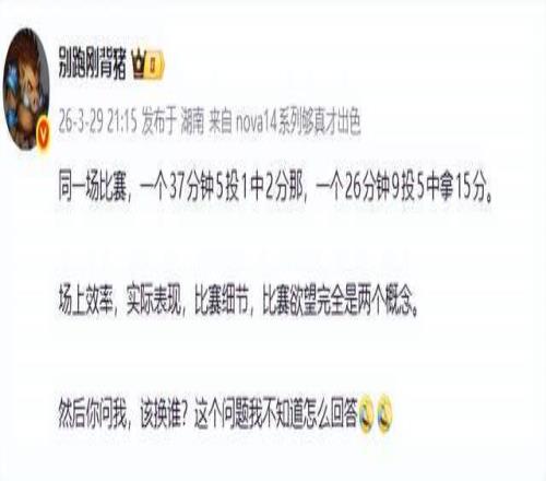 然而,廣東媒體人“別跑剛背豬”在社交平臺公開質(zhì)疑:“同一場比賽,一個37分鐘5投1中2分那,一個26分鐘9投5中拿15分。場上效率,實(shí)際表現(xiàn),比賽細(xì)節(jié),比賽欲望完全是兩個概念。然后你問我,該換誰?這個問題我不知道怎么回答。”這一質(zhì)問直指教練組用人邏輯。表面上看,陳家政的效率數(shù)據(jù)碾壓張皓嘉;但若僅以得分論英雄,將忽略籃球運(yùn)動中“非數(shù)據(jù)貢獻(xiàn)”的真實(shí)價值——如防守壓迫、掩護(hù)質(zhì)量、輪轉(zhuǎn)速度與精神屬性。