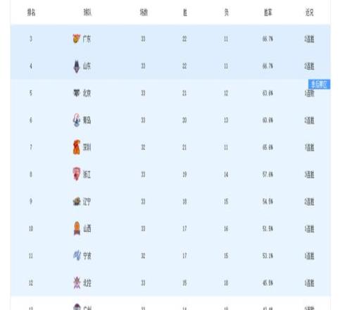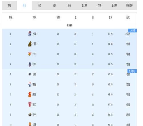 截至第33輪,廣東、山東分別以22勝位居積分榜第三、第四,且以上四隊之間勝場數最大差距僅為2個,所以他們都有機會在常規(guī)賽落幕前躋身四強。