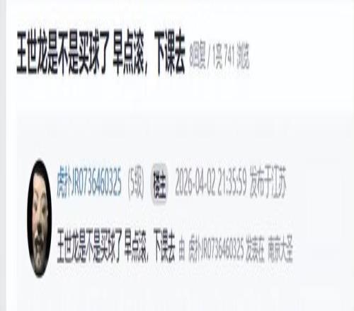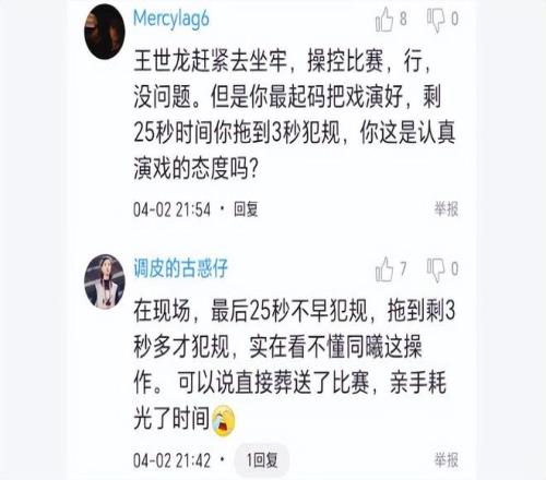 賽后王世龍的操作遭到球迷炮轟,也懷疑他操控比賽,“南京最近操作看,很明顯這賽季已經(jīng)放棄了,大家一塊賺錢不香?”、“今天肯定下重注對面贏了,一系列謎之操作”。眾多球迷怒斥道:王世龍是不是買球了,早點(diǎn)滾,下課去!