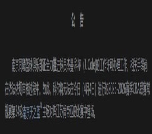至于原因,南京同曦球隊也在官方公告中解釋J.Cole工作許可證還沒下來,相關(guān)手續(xù)尚在審核中。