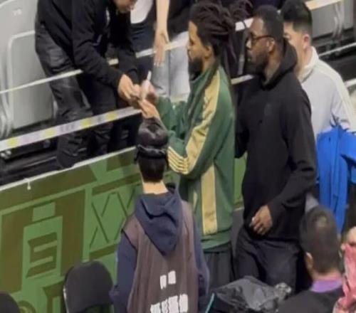 雖然沒能上場,但在比賽結(jié)束后 J.Cole還 跟著球隊繞場一周,主動和現(xiàn)場的歌迷擊掌互動,并且會停下來為他們簽名或者合影。