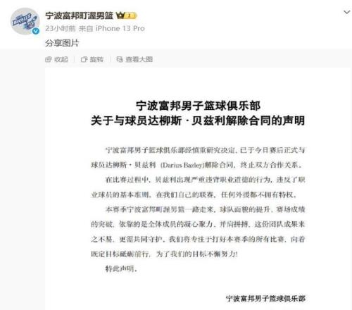 昨天晚上的比賽,寧波隊(duì)在主場以97-119不敵上海隊(duì),送給上海隊(duì)17連勝。這場比賽剛開始55秒寧波隊(duì)就因?yàn)楸荣愂д`等問題發(fā)生內(nèi)訌,外援貝茲利先是推搡隊(duì)友,隨后又和主教練發(fā)生口頭沖突,甚至出口辱罵寧波隊(duì)的管理層和老板。球隊(duì)方面也是當(dāng)機(jī)立斷,在當(dāng)天晚上就宣布和貝茲利解除合同??偨?jīng)理劉家成表示,不管是國內(nèi)球員還是外援都不能破壞我們的團(tuán)結(jié),否則立馬滾蛋。
