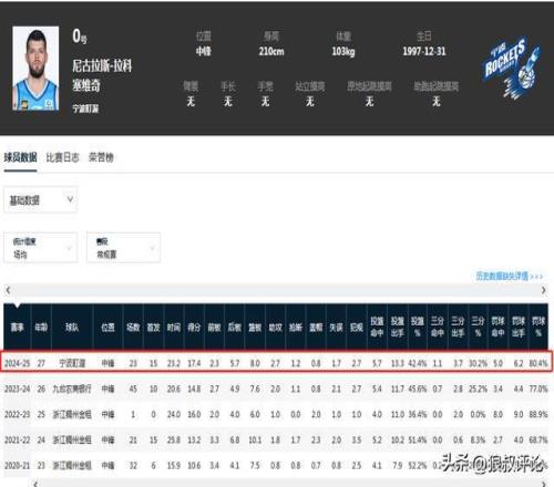 尼古拉斯-拉科塞維奇的職業(yè)生涯,從來不是一個大包大攬的頂級大外援,但2米10以上的身高,還有一定的三分球投籃威脅,以及能保護籃板球的特點,與這一支廣東男籃特點比較吻合。包括24-25賽季,尼古拉斯-拉科塞維奇代表寧波效力期間,場均23分鐘也能交出17.4分8籃板,場均2.3個前場籃板球成為主要的亮點。