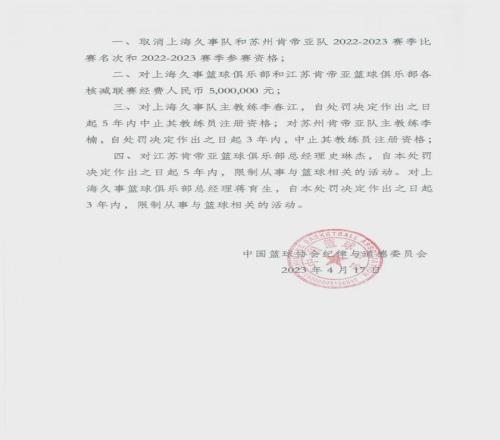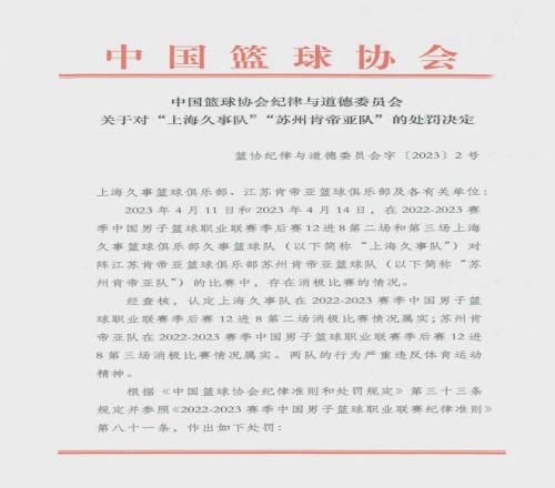 時間回到2023年4月17日,中國籃協(xié)開出一份重磅罰單:取消上海男籃和江蘇男籃在2022-23賽季的CBA聯(lián)賽比賽名次和參賽資格, 上海男籃和江蘇男籃各自被罰500萬元。