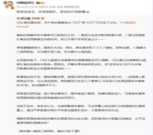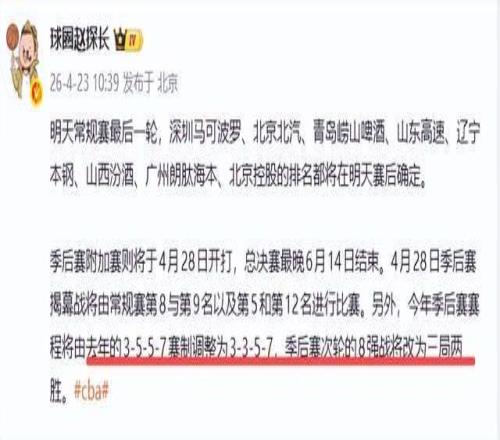 北時(shí)間4月24日消息,2026年CBA季后賽賽制再度調(diào)整,次輪(1/4決賽)由“五局三勝”壓縮為“三局兩勝”,整體賽程從“3-5-5-7”變?yōu)椤?-3-5-7”,附加賽將于4月28日開打,總決賽最晚6月14日落幕。這一變動(dòng)引發(fā)球迷強(qiáng)烈質(zhì)疑:“常規(guī)賽冗長(zhǎng)低質(zhì),季后賽卻草率縮水”,職業(yè)聯(lián)賽的穩(wěn)定性與競(jìng)技尊嚴(yán)正被持續(xù)侵蝕。