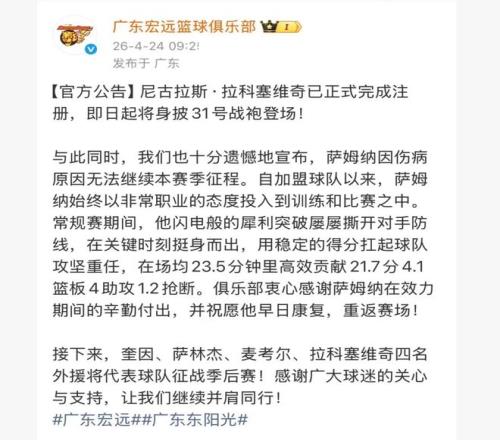 隨著尼古拉斯·拉科塞維奇完成CBA球員注冊,杜鋒還做出了一個重要的決定,沒錯,那就是辭退廣東隊的得分王薩姆納,至于為何會辭退薩姆納,這也是一個無奈之舉, 原因就是他受傷了,而且,短時間內(nèi)無法康復,最終,杜鋒只能是棄用薩姆納。
