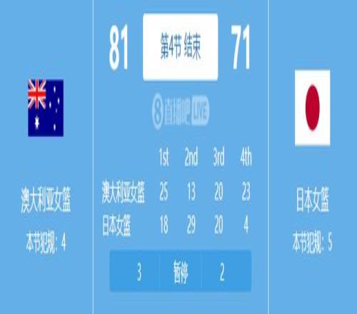 首節(jié)比賽,澳大利亞女籃25-18領(lǐng)先7分,隨后第二節(jié),日本女籃發(fā)力,轟下29-13的攻擊波,上半場結(jié)束變?yōu)轭I(lǐng)先9分。第三節(jié),雙方23-23平,直到最后一節(jié)發(fā)生了轉(zhuǎn)折點(diǎn),日本女籃僅僅得到4分,單節(jié)輸了19分,最終71-81不敵澳大利亞女籃,連續(xù)兩場遭到逆轉(zhuǎn)。