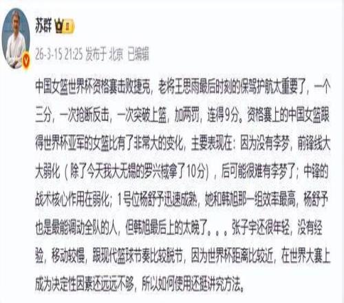 本次世預(yù)賽,中國(guó)女籃的外線表現(xiàn)難以讓人滿意,對(duì)陣捷克隊(duì)一役,全隊(duì)三分球21投僅6中,命中率低至28.6%。名嘴蘇群直言,如今的中國(guó)女籃與2022年世界杯亞軍陣容相比,最大的變化就是缺少了李夢(mèng),前鋒線實(shí)力大幅弱化。李夢(mèng)作為曾經(jīng)的鋒線核心,擁有出色的持球突破和外線投射能力,在2022年世界杯、2023年亞洲杯等大賽中屢建奇功,她的存在能為球隊(duì)提供穩(wěn)定的外線火力,還能通過突破牽扯對(duì)手防守,為內(nèi)線創(chuàng)造更多進(jìn)攻空間。沒有李夢(mèng)的牽制,中國(guó)女籃的內(nèi)線優(yōu)勢(shì)也難以充分發(fā)揮,李月汝、韓旭等內(nèi)線球員常常陷入對(duì)手的包夾之中,難以輕松接球得分。