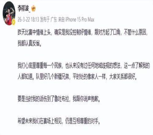 事件發(fā)酵后,李祥波于22日通過社交媒體發(fā)布致歉聲明:“我打心底尊重每一個民族,從未有過任何地域歧視的想法。若我的言語傷害了魯吐布拉,我向你真誠道歉?!逼浯朕o誠懇,明確將事件歸因于“情緒上頭”,并主動承擔溝通責任,展現出球員應有的擔當。