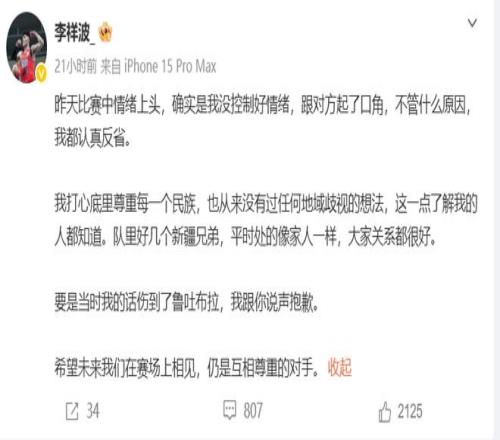 賽后劉家成和魯吐布拉都在個人社媒上發(fā)表了對李祥波“地域性攻擊”的不滿聲明,強烈要求李祥波出來道歉;