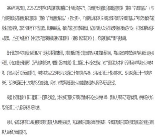 3月21日號下午,CBA聯(lián)賽分別開出了6張罰單,以李祥波和魯吐布拉在“比賽結(jié)束后發(fā)生言語沖突,雙方均使用了不當言語,魯吐布拉還有情緒激動、試圖與他人發(fā)生非必要身體接觸的行為,引發(fā)比賽場地多人聚集,給聯(lián)賽造成嚴重不良影響”為由,對李祥波處以停賽4場,罰款10萬的處罰,魯吐布拉停賽1場,罰款5萬