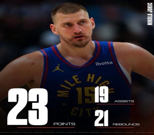 ——對陣獨行俠,約基奇19中8,得到23分21籃板19助攻,就差1次助攻就能達成NBA歷史上第四次單場20+20+20,罕見程度不輸給單場80+