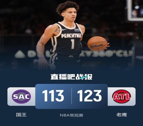 比賽上來,兩隊(duì)就打得很膠著,場上比分交替領(lǐng)先,在14-14平后老鷹一度有拉開分差的勢頭,但杰倫·約翰遜下場后國王趁勢完成反超,次節(jié)老鷹火力全開,其中亞歷山大-沃克單節(jié)獨(dú)得14分,全隊(duì)共轟下39分,在節(jié)末利用一波14-0的攻勢直接將分差拉開到兩位數(shù),半場結(jié)束時(shí)國王落后12分;下半場回來,兩隊(duì)一直圍繞著十分左右的分差展開拉鋸,末節(jié)國王還沒有放棄,他們成功抹平分差,緊要關(guān)頭杰倫·約翰遜站了出來,個(gè)人連拿5分并助攻沃克命中三分球,老鷹一波11-0穩(wěn)住局勢,最終老鷹力克國王,送給后者三連敗。