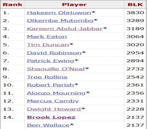 本場比賽過后,大洛生涯蓋帽總數(shù)來到2139,超越本·華萊士,獨居NBA歷史第14位。