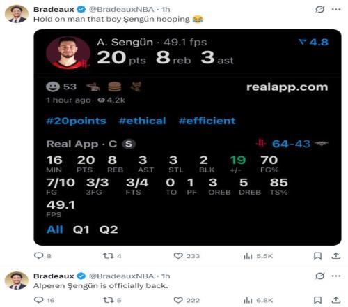 第二節(jié)申京8分鐘里6中4,三分3中3,罰球4中3,拿到14分5籃板4助攻3搶斷1蓋帽,半場16分鐘10中7+三分3中3拿到20分8籃板3助攻3搶斷2蓋帽,正負(fù)值+19。休媒Bradeaux:申京正式歸位了。
