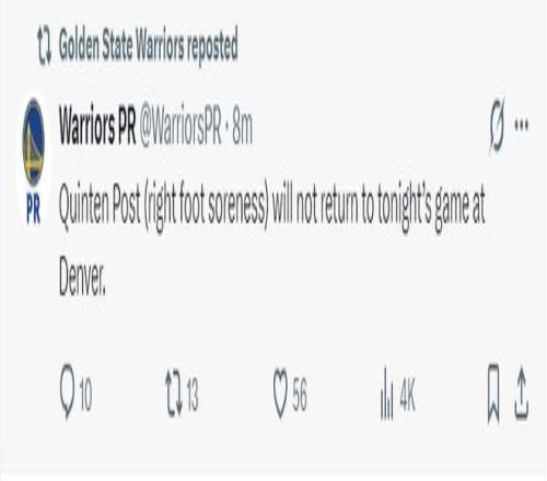 勇士官方:波斯特因為右腳酸痛本場比賽不會回歸。