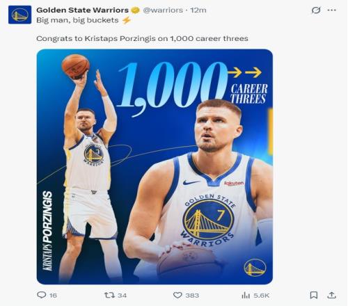 波爾津吉斯完成了生涯1000三分里程碑。