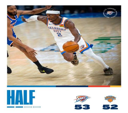 第二節(jié)開始后雷霆隊(duì)連得5分?jǐn)U大領(lǐng)先,阿奴諾比和布里奇斯各中三分追近,威廉姆斯打3分成功,本節(jié)進(jìn)行了7分鐘時(shí)雷霆隊(duì)以38-31領(lǐng)先。尼克斯隊(duì)外線再次開火,替補(bǔ)出場(chǎng)的阿爾瓦拉多連中2個(gè)三分球,布倫森也錦上添花,半場(chǎng)前4分45秒時(shí)尼克斯隊(duì)追成42平?;裟犯駛惔?分引領(lǐng)球隊(duì)連拿7分再次拉開,哈特三分回應(yīng),亞歷山大兩罰全中,雷霆隊(duì)以51-45領(lǐng)先。尼克斯隊(duì)又掀起反攻,布倫森和哈特分別投中三分,一輪7-2的反擊高潮結(jié)束第二節(jié),他們以52-53落后1分進(jìn)入半場(chǎng)休息。