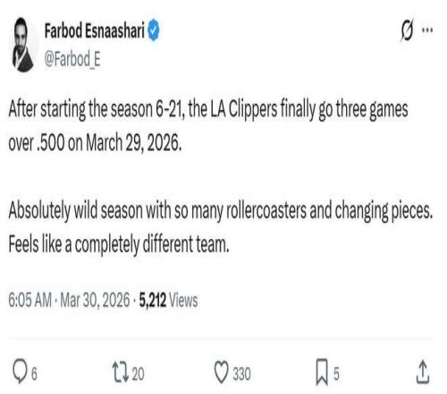 這一系列的喜訊也是這支快船隊(duì)在常規(guī)賽中后段傲人表現(xiàn)的縮影,正如船記Farbod Esnaashari所說(shuō),對(duì)于快船隊(duì)來(lái)說(shuō),這是一個(gè)堪稱過(guò)山車式瘋狂的賽季。