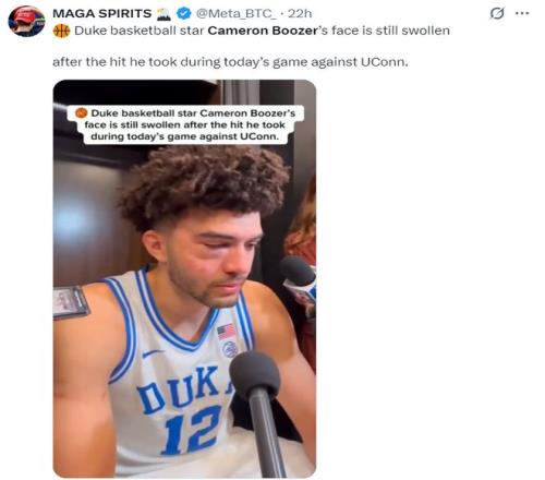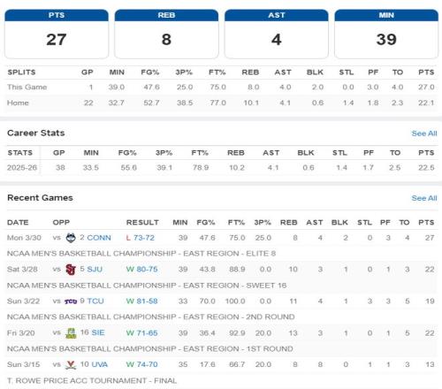 在NCCA瘋狂三月精英八強(qiáng)賽中,卡梅隆-布澤爾全場比賽39分鐘,21中10,三分4中1,拿到27分8籃板4助攻4失誤2蓋帽,命中率47.6%。但杜克大學(xué)在終場前6.5秒領(lǐng)先2分還手握球權(quán)的情況下,卡梅隆的弟弟凱登傳球失誤,最終康大的馬林斯超遠(yuǎn)三分絕殺。