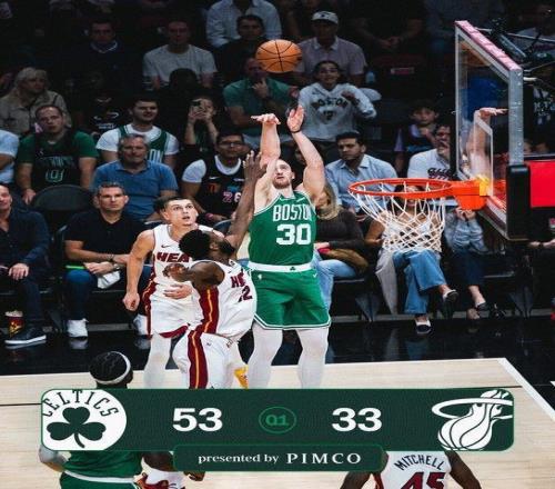 在凱爾特人對(duì)陣熱火的首節(jié)比賽,熱火首節(jié)得到33分表現(xiàn)不俗,但凱爾特人卻是更恐怖的狂轟53分,將熱火的防守給徹底打穿,尤其是讓熱火的外線防守形同虛設(shè)。