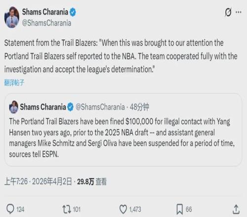 北京時(shí)間4月2日上午,據(jù)ESPN名記Shams報(bào)道,因在選秀前兩年(2023年12月)與楊瀚森非法接觸,開拓者被NBA罰款10萬美元!除此之外,開拓者助理總經(jīng)理塞爾吉-奧利瓦和邁克-施密茨均被球隊(duì)停薪停職,等待進(jìn)一步處理。
