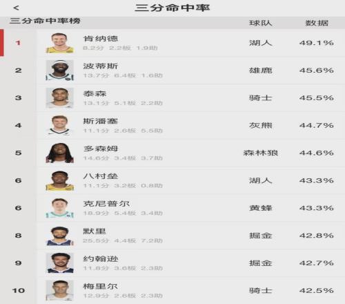 加盟森林狼后,多森姆打了19場,其中5場首發(fā)。場均出戰(zhàn)27.9分鐘,得到13.5分4.3籃板3.7助攻0.9搶斷,三項(xiàng)命中率:53.1%,43.1%,88%。本賽季三分命中率44.6%,高居聯(lián)盟第五,僅次于肯納德、波蒂斯、泰森和斯潘塞。