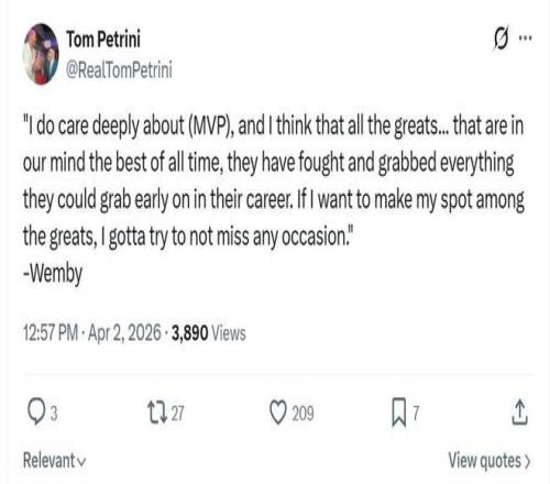 文班的野心不只有MVP,還希望率隊在本賽季拿下總冠軍,他在賽后坦言每當想到即將到來的季后賽自己都會無比興奮。