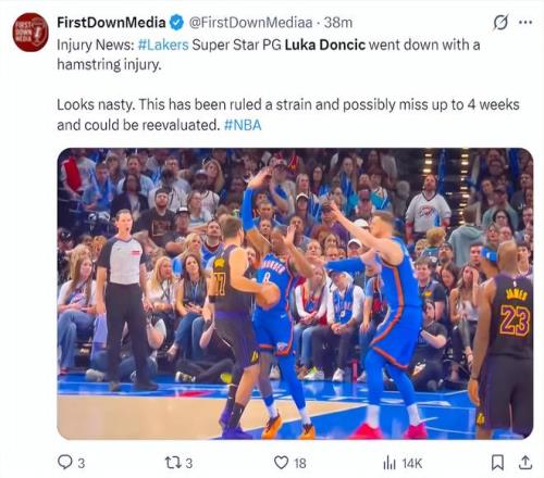 根據(jù)美媒FDM的說法,傷病消息,湖人球星東契奇因為左腿筋拉傷退場,看起來情況停糟糕,這至少會被判定輕微拉傷可能需要4周的康復時間,并且是四周后重新評估。(東契奇這次的傷勢還會影響他評獎,他還差1場才打滿65場)