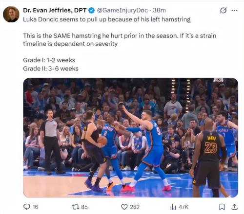 根據(jù)醫(yī)學專家埃文-杰弗里斯的分析,東契奇應該是因為左腿筋的問題提前停下來,這正是他本賽季之前受傷的同一側(cè)腿筋,如果還是拉傷恢復時間取決于嚴重程度:一級拉傷需要1-2周、二級拉傷需要3-6周。