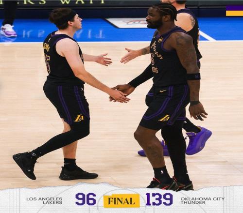 湖人隊在東契奇退場后也更快的崩盤,最終湖人96-139慘敗雷霆,這場比賽湖人替補席顯得非常沮喪,勒布朗雙眼無神,里夫斯在替補席一直低著頭。東契奇則沒有回到替補席他一直在更衣室治療。