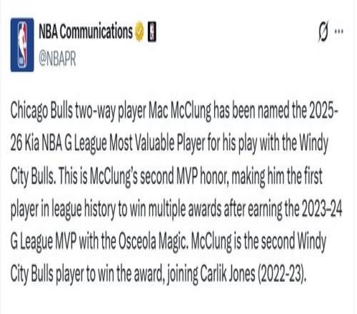 麥克朗上一次當選MVP是2023-24賽季效力于奧西奧拉魔術期間。再往前一個賽季,他還隨特拉華藍衫軍奪得了G聯(lián)賽總冠軍。