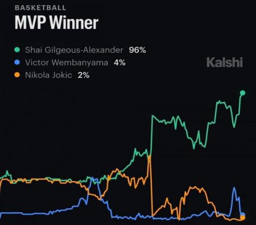 文班亞馬本賽季心氣很高,人氣也高,首次入選全明星,而且還是MVP候選人。最新一期的MVP排行榜中,文班亞馬就高居榜首,力壓SGA和約基奇。不過就在今天,知名預(yù)測(cè)平臺(tái)Kalshi更新了最新的MVP獲獎(jiǎng)概率,SGA高達(dá)95.5%,文班亞馬只有3.5%,約基奇只有1.5%,如果Kalshi預(yù)測(cè)準(zhǔn)確,那么SGA基本鎖定MVP了。本賽季亞歷山大場(chǎng)均31.4分4.4籃板6.5助攻1.4搶斷,文班亞馬場(chǎng)均24.8分11.5籃板3.1助攻1搶斷3.1蓋帽,約基奇場(chǎng)均28分12.9籃板10.9助攻1.4搶斷。這三人大概率都會(huì)入選最佳陣容一陣。