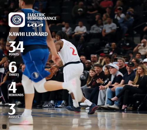 對陣獨行俠一戰(zhàn),科懷-倫納德30分鐘打卡(三節(jié))19中11,三分10中6,罰球9中6,拿到34分4籃板3助攻1搶斷,命中率57.9%,三分命中率60%。他連續(xù)55場比賽完成20+繼續(xù)刷新快船隊史紀錄。