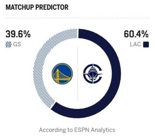 今天ESPN給出本場(chǎng)勝率預(yù)測(cè),快船60.4%占優(yōu),勇士為39.6%。