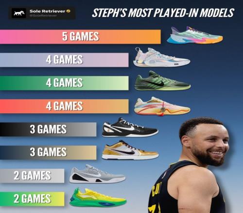 體育播報4月17日宣 球鞋媒體Sole Retriever匯總了本賽季庫里穿著的品牌和具體款式場次及比例。