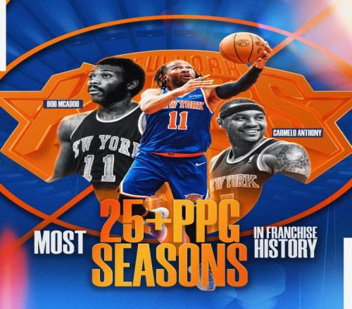 這樣以來(lái),他也追平了鮑伯·麥卡杜、安東尼,成為了尼克斯隊(duì)史上并列最多拿到過(guò)賽季場(chǎng)均得分25+的球員。