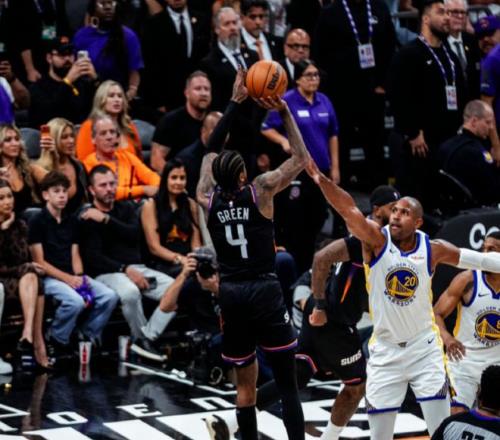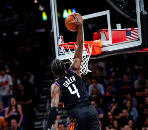相較于布克偏投射的打法,杰倫·格林多了一個(gè)持球突破造殺傷的選擇,更能撕扯開(kāi)勇士的防守陣型。