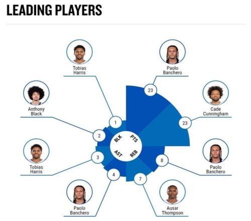 上半場打完坎寧安12中5,三分4中1,拿到14分4籃板1助攻;班凱羅9中5+三分2中2拿到17分7籃板2助攻,兩人差距不大。