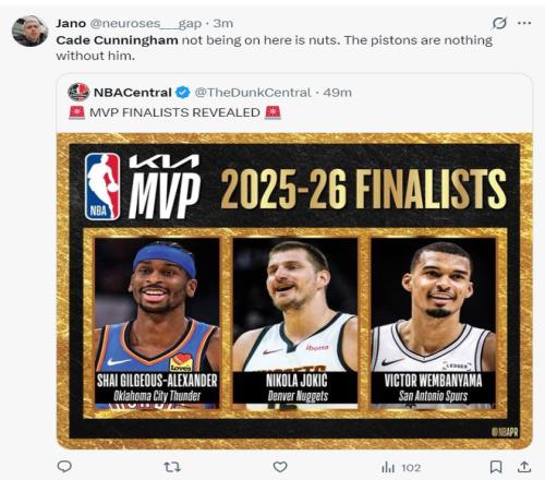 這場比賽之前NBA官方公布了本賽季的MVP候選人名單:亞歷山大、約基奇、文班亞馬。有活塞球迷為CC抱不平:很奇怪沒有坎寧安,因為活塞如果沒有坎寧安的話什么也不是。