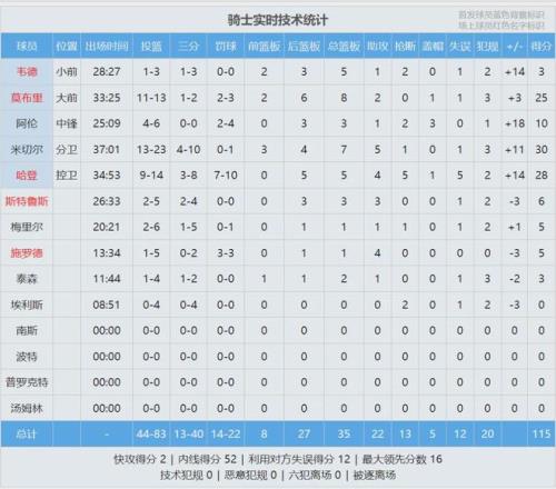 全場(chǎng)結(jié)束,騎士115-105戰(zhàn)勝猛龍,騎士2比0領(lǐng)先。米切爾30分7板5助、哈登28分5板4助5斷、莫布利25分8板2助。英格拉姆15中3,僅得7分4板3助5失誤,今年季后賽最讓人失望的球員!最后看看比賽數(shù)據(jù),說(shuō)說(shuō)你的心情: