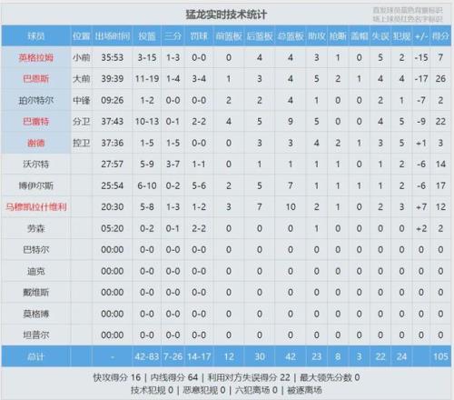 本賽季常規(guī)賽,猛龍三分命中率35.4%,僅排聯(lián)盟第21位,場(chǎng)均得分同樣是聯(lián)盟第21。說(shuō)回今天這場(chǎng)比賽,英格拉姆和巴恩斯輪流打鐵,第一節(jié)這哥倆合計(jì)5中0得到0分3籃板2助攻。猛龍從一開(kāi)場(chǎng)就被騎士壓制,從來(lái)沒(méi)有領(lǐng)先過(guò)。