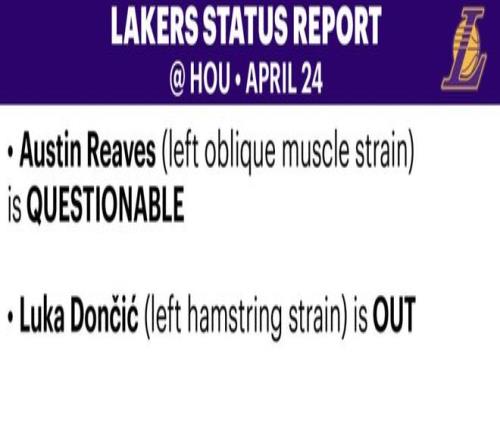 北京時間4月24日,湖人目前總比分2-0領(lǐng)先火箭,官方更新了G3的傷病報告。好消息是里夫斯(左側(cè)腹外斜肌拉傷)的狀態(tài)升級為出戰(zhàn)成疑,G3有望復(fù)出。東契奇繼續(xù)被列為缺戰(zhàn)狀態(tài),籠罩球隊的最大疑問依舊沒變:東契奇何時復(fù)出?
