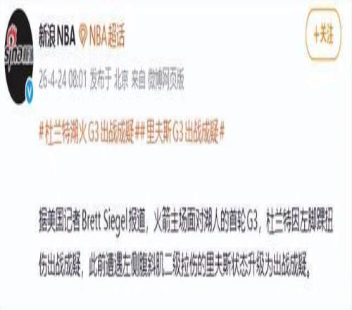 更嚴峻的是,火箭隊官方于4月23日更新傷情報告:杜蘭特除原有膝傷外,新增左腳踝扭傷,G3出戰(zhàn)狀態(tài)為“出戰(zhàn)成疑”。這意味著他能否登場,將在賽前熱身結(jié)束后才最終決定。