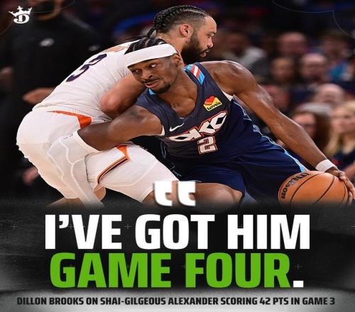 當(dāng)被問及SGA那不可阻擋的42分表現(xiàn)時,狄龍一本正經(jīng)地幽默了一把:“他效率確實高?!彪S后他直接攤牌,“G4我來防他!”(原話:I got him Game 4)。