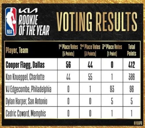 據(jù)統(tǒng)計(jì),弗拉格拿到了56張第一選票,克尼普爾拿到了44張第一選票,弗拉格最終的得分是412分,克尼普爾則是386張,兩人僅僅相差26分。在NBA歷史上,其實(shí)有過兩名球員共享年度最佳新秀球員獎(jiǎng)的情況,不過這一次還是弗拉格贏了,他的表現(xiàn)和上限都更高。