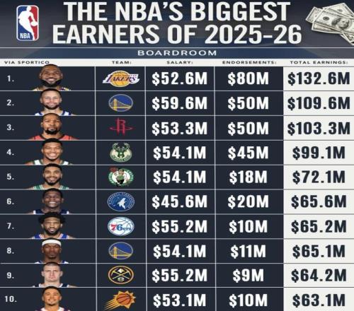 NBA最新的收入榜單(2025—26賽季)出爐,直接扯下了聯(lián)盟最現(xiàn)實(shí)的遮羞布:打得好,根本不等于賺得多!約基奇、字母哥在場(chǎng)上呼風(fēng)喚雨、數(shù)據(jù)爆炸,但在真正的“撈金游戲”里,卻被幾個(gè)快退役的“老將”按在地上摩擦。為什么聯(lián)盟力捧的當(dāng)打新王,場(chǎng)外吸金能力連老將的尾燈都看不到?這份榜單扒開(kāi)了球星賺錢(qián)的底層邏輯:在NBA,頂薪只是入場(chǎng)券,真正讓你跨越階層的,從來(lái)不是你在場(chǎng)上拿了多少分。