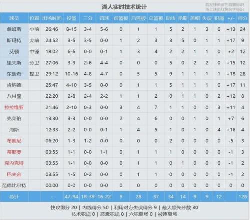 三節(jié)戰(zhàn)罷,湖人96-76領(lǐng)先整整20分。詹姆斯前三節(jié)11中5得到14分,第四節(jié)4中3砍下10分。最后半節(jié)雙方換上純替補陣容,全場結(jié)束,湖人128-104大勝國王24分,背靠背取得2連勝。東契奇28分5板9助、詹姆斯24分5助2斷。